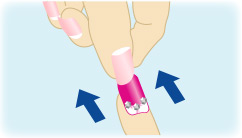 粘着グミの付いたネイルチップを爪に載せ、ネイルチップが爪にしっかり貼り付くまで押しつけててください。